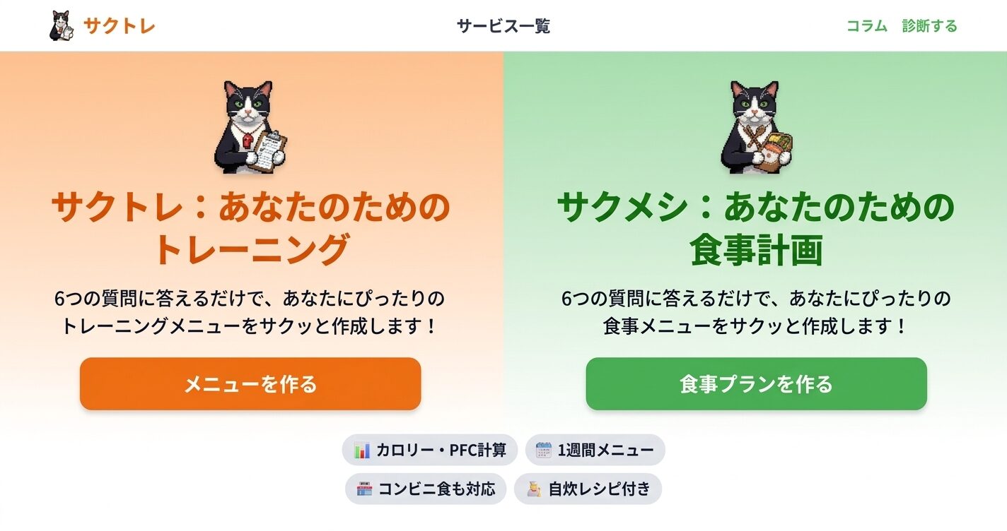 AIで筋トレも食事もサクッと解決——「サクトレ」と「サクメシ」を作りました 公開日:2026年3月29日 コラム なぜ作ったのか 筋トレを始めたのは20代のころです。当時の体重は90kgを超えていました。 特別な病気があったわけでも、極端な生活をしていたわけでもありません。 ただ、食べすぎていたし、動いていなかった。それだけです。 […] 続きを読む